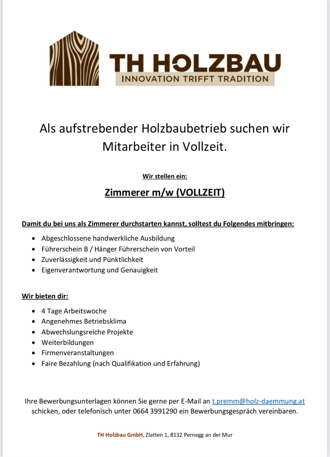 Die TH Holzbau GmbH sucht einen Zimmerer (w/m). Nähere Informationen finden Sie im Downloadbereich.