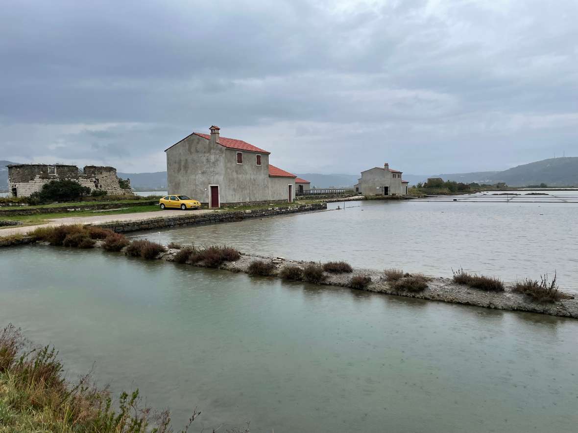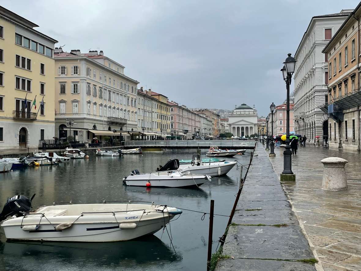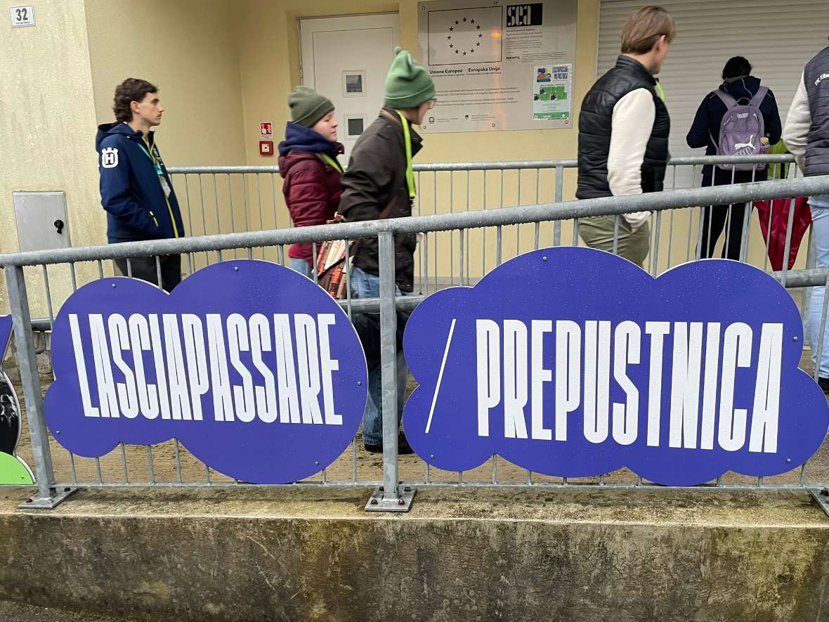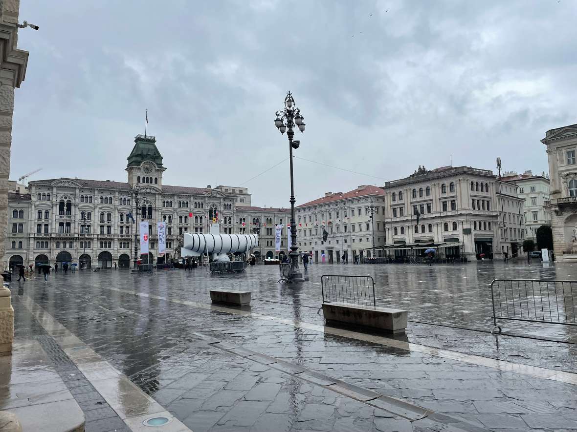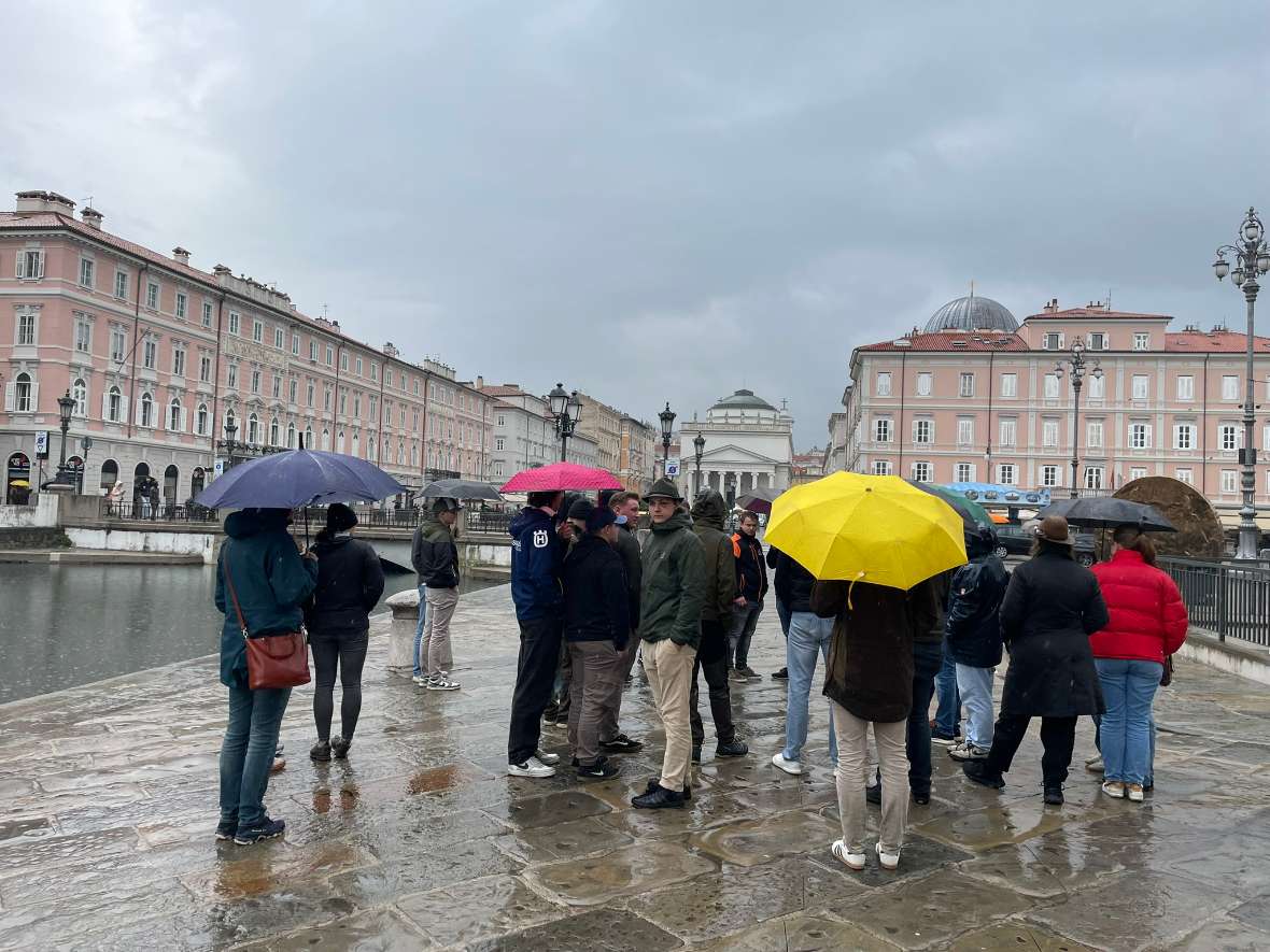 Den zweiten Tag begannen wir bei den Salinen von Sečovlje, wo uns das Leben der Salzbauern erklärt wurde. Wir konnten sogar eine große Schar an Flamingos in den Salzfeldern beobachten. Danach ging es zu unserer nächsten Station, die Stadt Triest/Trieste/Trst. Die Schüler*innen des Italienischunterrichts erklärten uns Sehenswürdigkeiten der Stadt. Zum Mittagessen gab es natürlich einen italienischen Klassiker: Pizza. Aufgrund eines erneuten starken Regengusses haben wir das Dessert nicht im Eissalon genossen, sondern gleich in der Pizzeria. Gestärkt und getrocknet ging es zur Kulturhauptstadt Nova Gorica-Gorizia, wo wir auf der Šverc-tura, also der Schmugglertour nicht nur erfuhren, wie es zur Teilung der Stadt kam, sondern was das auch für das Leben der Menschen bedeutet hat. Also wurden die Schüler:innen zu Schmugglern und mussten Wurst über die Grenze schmuggeln, gegen Kaffee tauschen und natürlich aufpassen, dass sie nicht an der Grenze erwischt wurden. Dann hatten wir genug von Regen und Kälte, checkten im Hotel ein und anschließend wärmte uns ein gorizianisches Gulasch und Tiramisu den Magen.