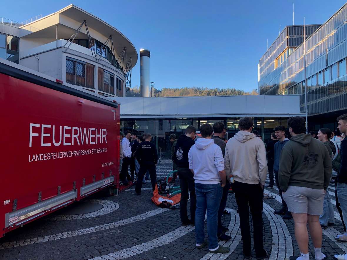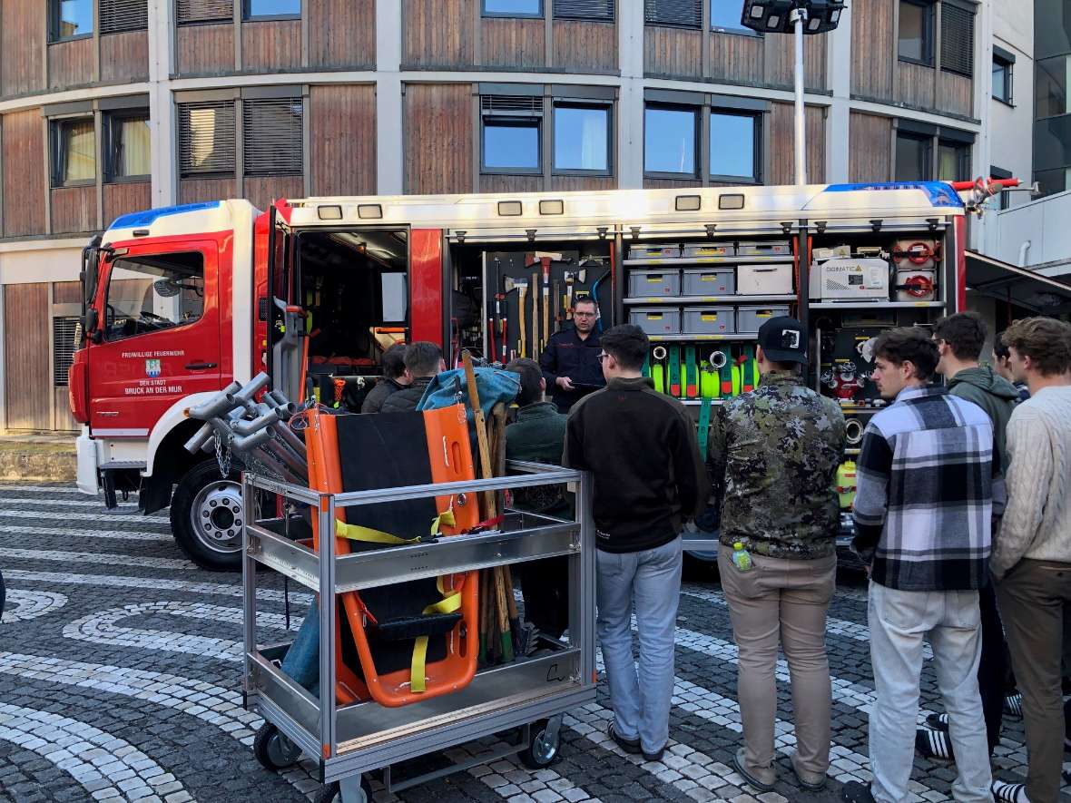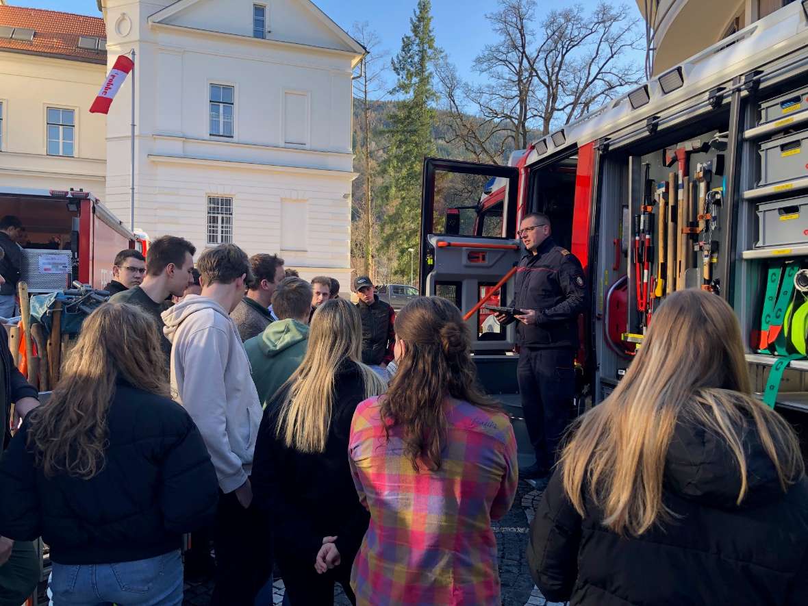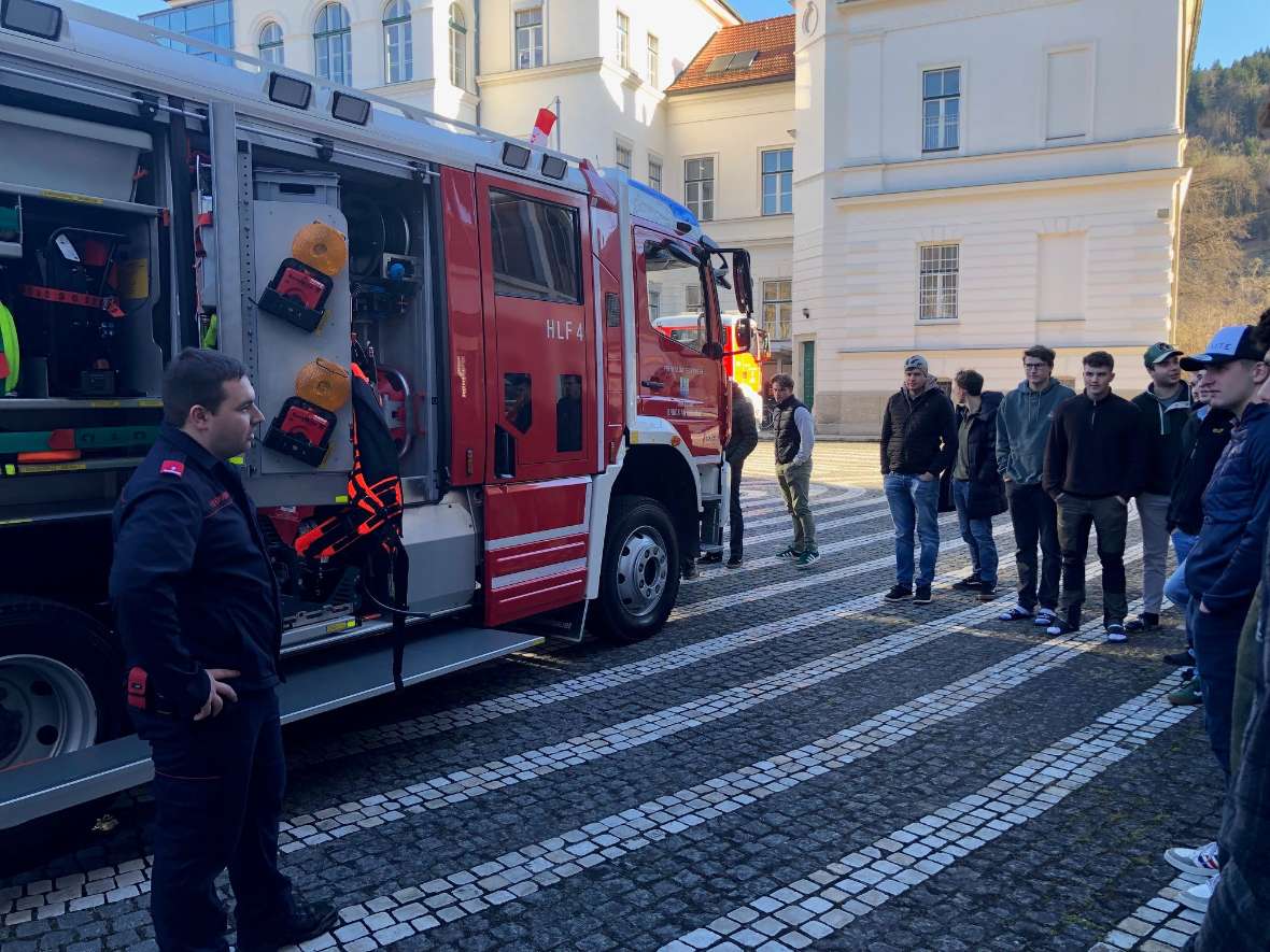 „Wie löscht man einen Vegetationsbrand? Dieter PILAT, EU Forest Fire Expert, beantworte sehr anschaulich diese spannende Frage und verwies auf die notwendige Unterstützung seitens der Forstwirtschaft in der Waldbrandbekämpfung vor Ort, aber auch in der Prävention. Anschließend stellte ABI d. F. Bernd FLADISCHER mit seinen Kollegen von der BFV Bruck die Feuerwehrgeräte den Schülerinnen und Schülern im Innenhof der Forstschule vor. Ein besonderes Highlight waren der WAB Flugdienst und der HLF 4.